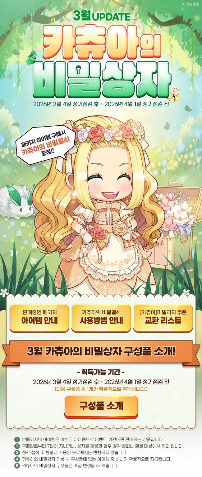 판매중인 패키지 아이템 안내 카츄아의 비밀열쇠 사용방법 안내 [카츄아]마일리지 쿠폰 교환 리스트 3월 카츄아의 비밀상자 구성품 소개