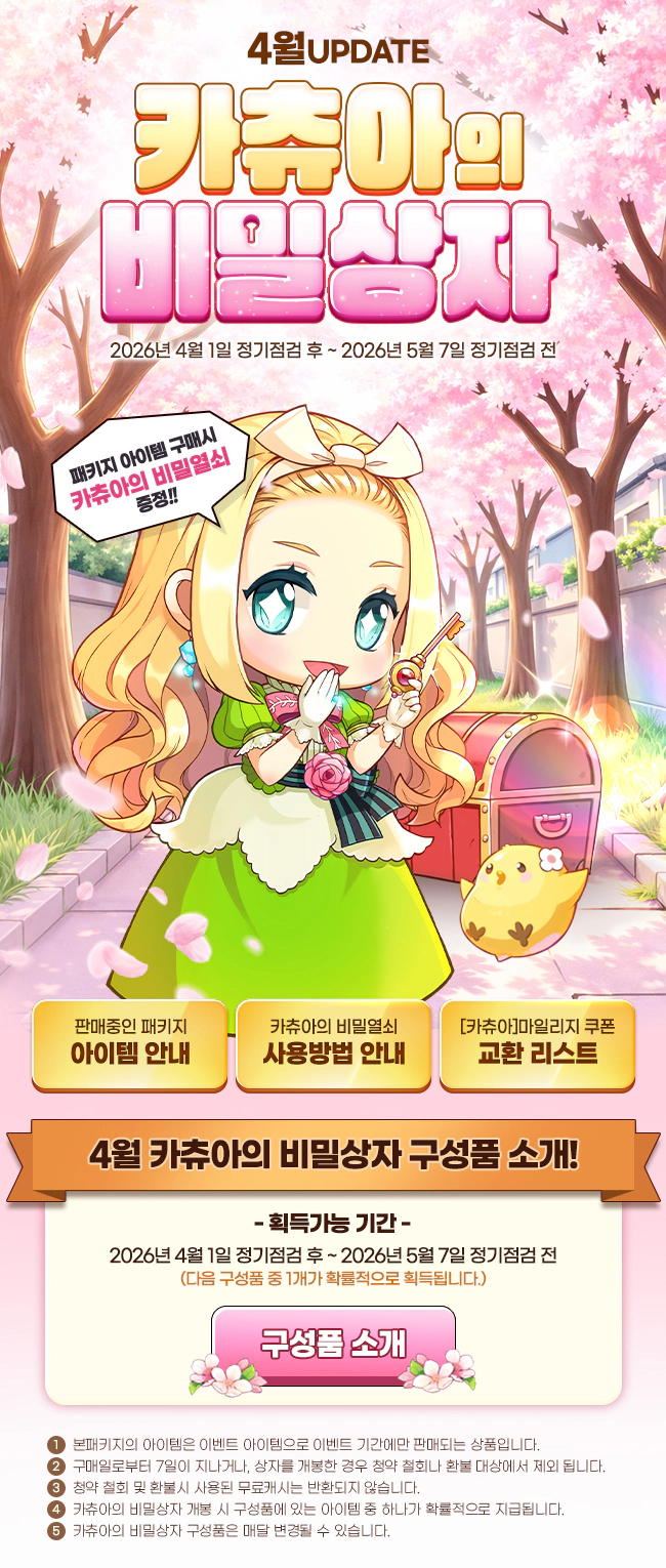 판매중인 패키지 아이템 안내 카츄아의 비밀열쇠 사용방법 안내 [카츄아]마일리지 쿠폰 교환 리스트 4월 카츄아의 비밀상자 구성품 소개