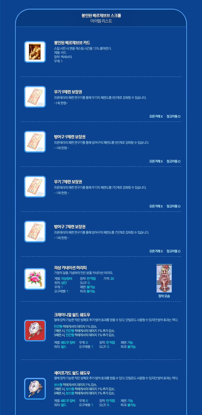 - 봉인된 베르제브브 스크롤 : 기간 한정 봉인된 베르제브브 스크롤봉인된 베르제브브 카드, 무기 9제련 보장권, 방어구 9제련 보장권, 크레이니얼 쉴드 쉐도우, 세이프가드 쉴드 쉐도우, 의상 카네이션 머리띠,의상 인 챈트 스톤 상자II, 의상 교환쿠폰 등 여러가지 희귀한 아이템 중 하나를 얻을 수 있다. 무게:1 모든거래 X, 창고이동 O