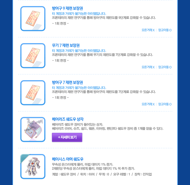 프론테라의 제련 연구가를 통해 무기의 제련도를 9단계로 강화할 수 있습니다. - 1회 한정 - 모든거래X, 창고이동O -