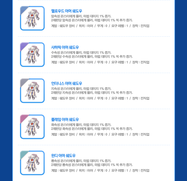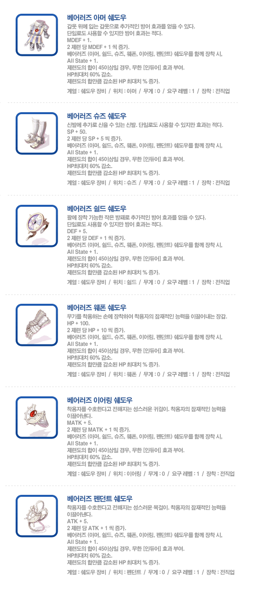 계열 : 쉐도우 장비 / 위치 : 아머 / 무게 : 0 / 요구 레벨 : 1 / 장착 : 전직업 -