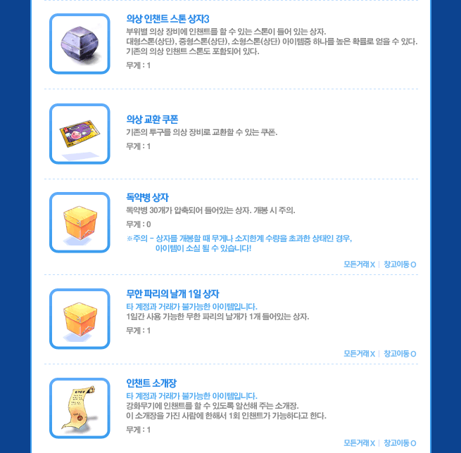 "주의 - 상자를 개봉할 때 무게나 소지한계 수량을 초과한 상태인 경우, 아이템이 소실 될 수 있습니다!"