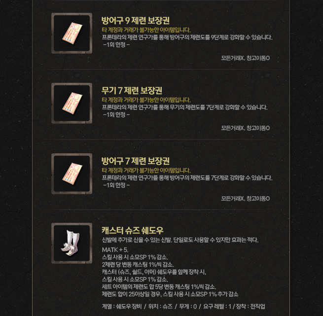 계열 : 쉐도우 장비 / 위치 : 슈즈 / 무게 : 0 / 요구 레벨 : 1 / 장착 : 전직업 -