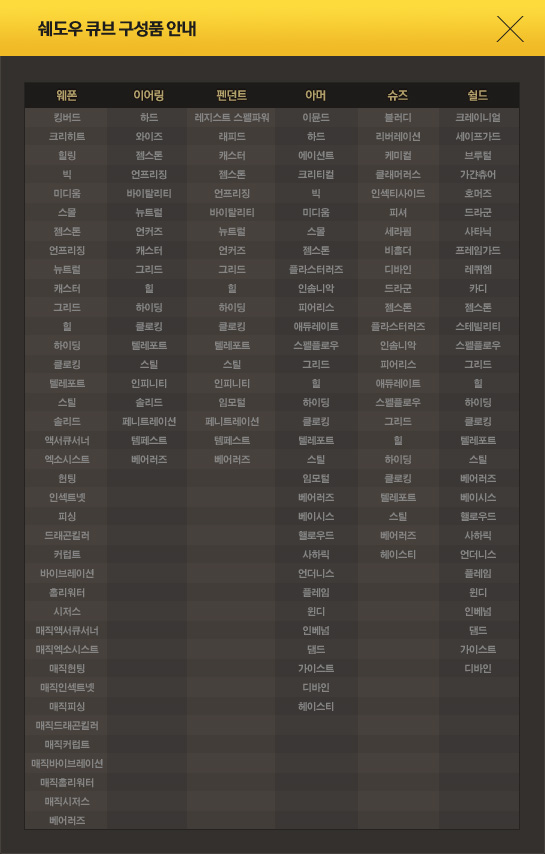 | 웨폰 | 이어링 | 펜던트 | 아머 | 슈즈 | 쉴드 |