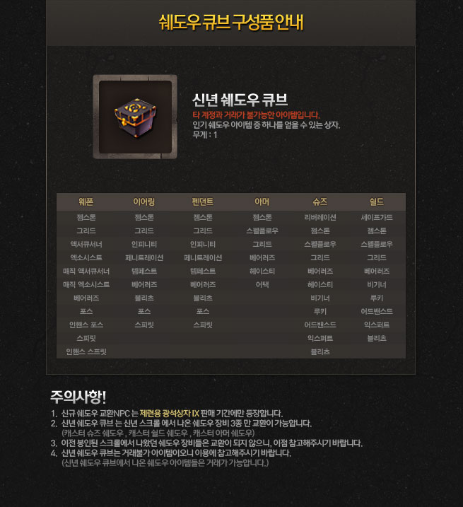 - 신년 쉐도우 큐브는 거래불가 아이템이오니 이용에 참고해주시기 바랍니다. (신년 쉐도우 큐브에서 나온 쉐도우 아이템들은 거래가 가능합니다.)