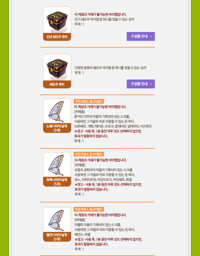 HP회복스톤(걸칠것), SP회복스톤(걸칠것) 이 추가되었으며 기존의 의상 인챈트 스톤도 포함되어 있다.