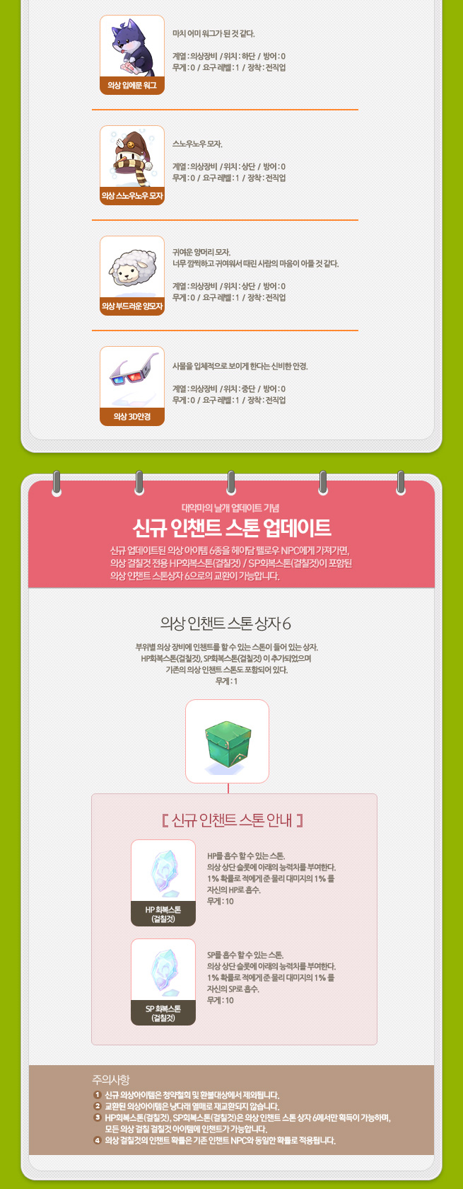 - HP회복스톤(걸칠것), SP회복스톤(걸칠것)은 의상 인챈트 스톤 상자 6에서만 획득이 가능하며, 모든 의상 걸칠것 아이템에 인챈트가 가능합니다.