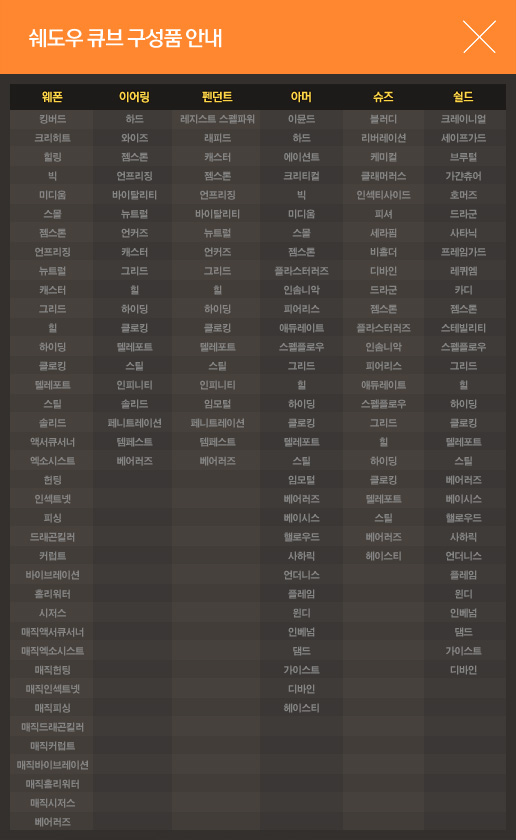 | 웨폰 | 이어링 | 펜던트 | 아머 | 슈즈 | 쉴드 |