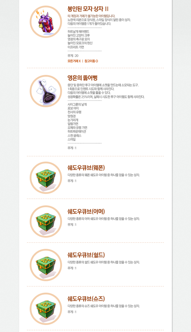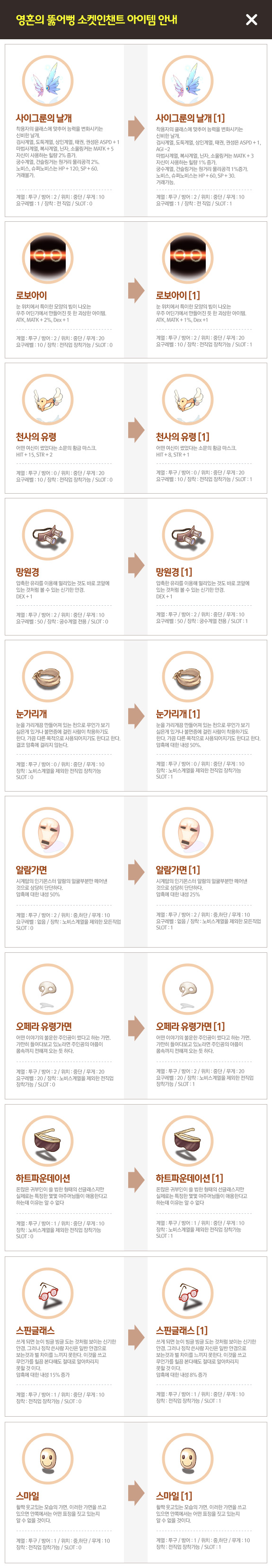 | 천사의 유령 어떤 여신이 썼었다는 소문의 황금 마스크. HIT + 15, STR + 2 계열 : 투구 / 방어 : 0 위치 : 중단 / 무게 : 20 장착 : 전직업 장착가능 SLOT:0 | -> | 천사의 유령[1] 어떤 여신이 썼었다는 소문의 황금 마스크. HIT + 8, STR + 1 계열 : 투구 / 방어 : 0 위치 : 중단 / 무게 : 20 장착 : 전직업 장착가능 SLOT:1 |