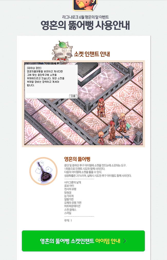 - 1. 영혼의 뚫어뻥으로 소켓인챈트 시도 시 파괴확률이 존재하며, 소켓인챈트 실패시 장비아이템도 파괴됩니다.