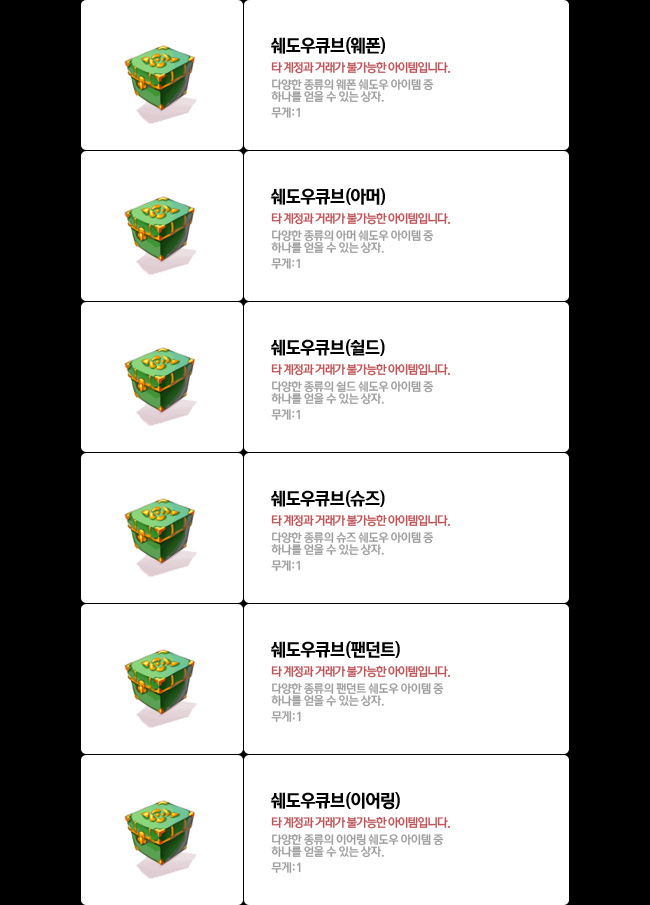 다양한 종류의 웨폰 쉐도우 아이템 중 하나를 얻을 수 있는 상자.