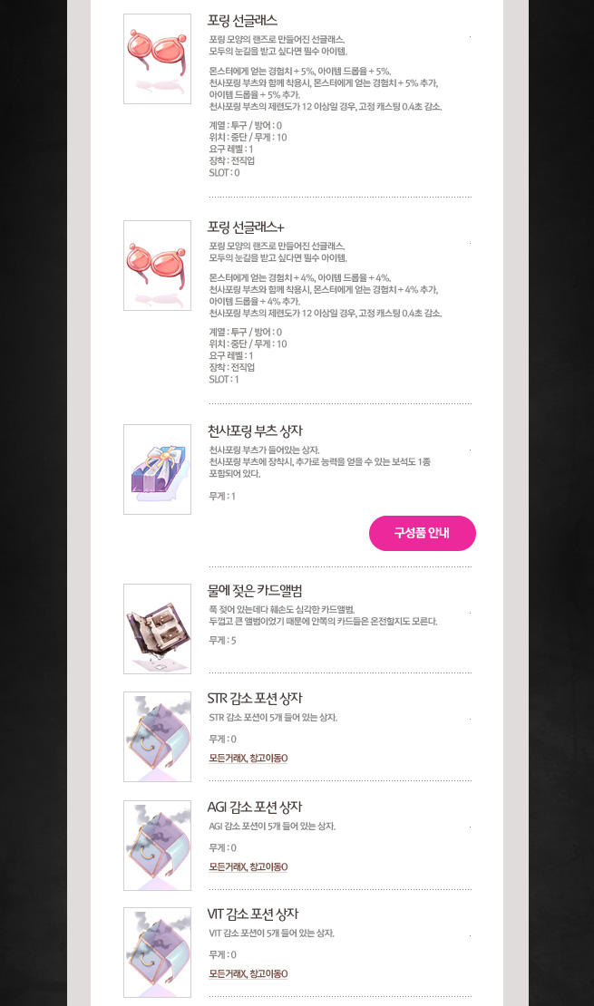 천사포링 부츠와 함께 착용시, 몬스터에게 얻는 경험치 + 4% 추가, 아이템 드롭율 + 4% 추가.