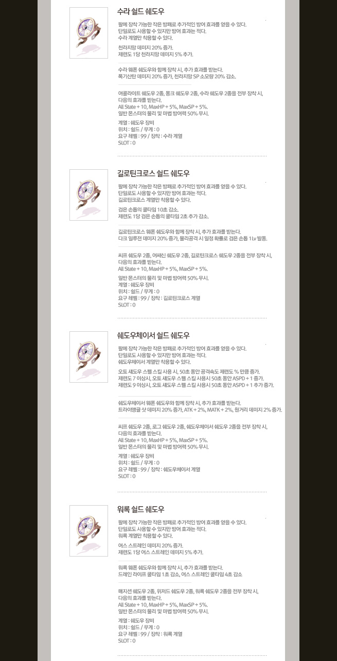 소드맨 쉐도우 2종, 크루세이더 쉐도우 2종, 로얄가드 쉐도우 2종을 전부 장착 시, 다음의 효과를 받는다.
