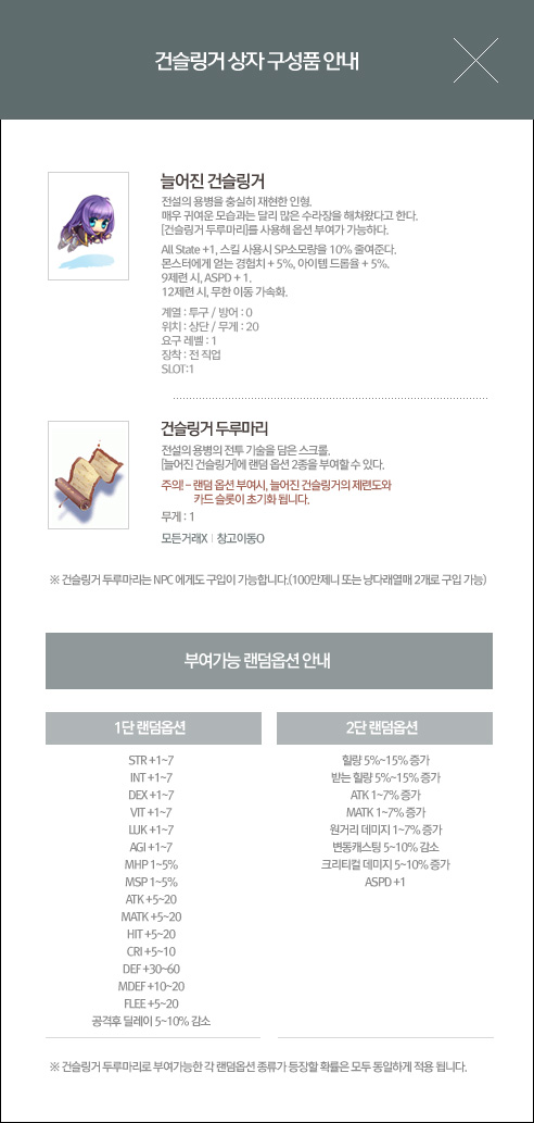 ※ 건슬링거 두루마리로 부여가능한 각 랜덤옵션 종류가 등장할 확률은 모두 동일하게 적용 됩니다.